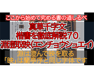 真草千字文(楷書)徹底解説70淵澄取映(エンチョウシュエイ)淵は澄んで映を取る、「映」は蘭亭序にも出てきます。静止した蘭亭序とも言われる真草千字文のこの字を要観察です