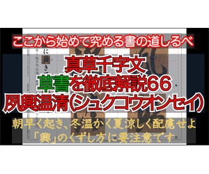 真草千字文(草書)徹底解説 66夙興温清(シュクコウオンセイ)朝早く起き冬温かく夏涼しく配慮すべし、「興」の草書体に注意です